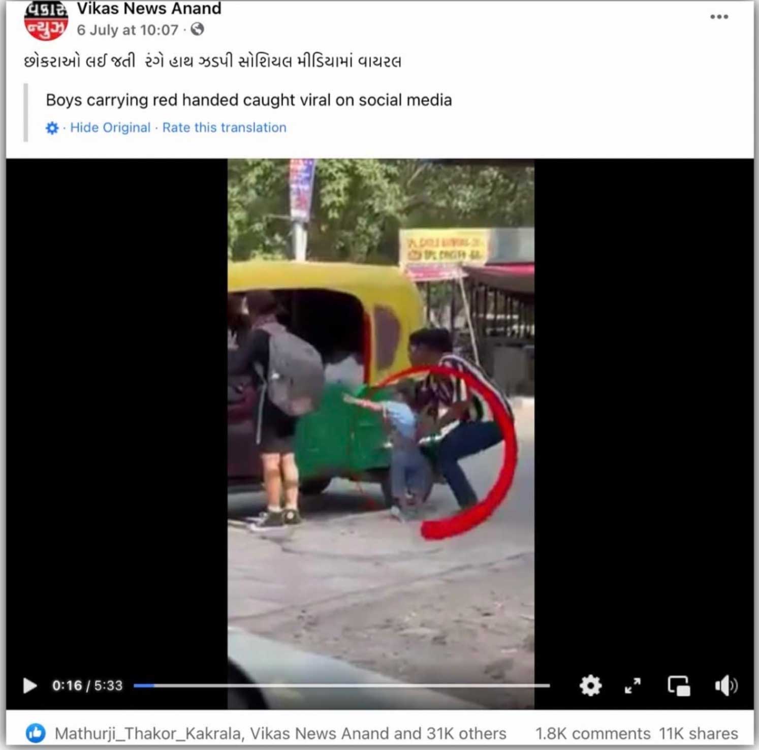 The video was originally posted on a Facebook page named Vikas News Anand. Viewed over 5 million times, the video caption in Gujarati roughly translates to 'child kidnapper caught red handed.'