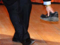 The shoe man who was seated at the back of the auditorim, stood up all of a sudden when PM Wen was delivering speech and said ' "How can you listen to this unchallenged?" before throwing a shoe that landed some distance from the premier.