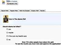 The Huffington Post has a screen shot of the poll. It asks, "Should Obama be killed?" The possible answers are "yes," "maybe," "If he cuts my health care" and "no."