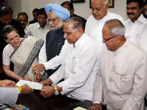 SP supremo Mulayam Singh Yadav, RJD chief Lalu Prasad, RLD chief Ram Vilas Paswan, Congress general secretary Rahul Gandhi and union ministers such as P Chidambaram, Farooq Abdullah, Ajit Singh, E Ahamed, AK Antony, Pawan Kumar Bansal, Ashwini Kumar were present at the time of Mukherjee filing his nomination papers.