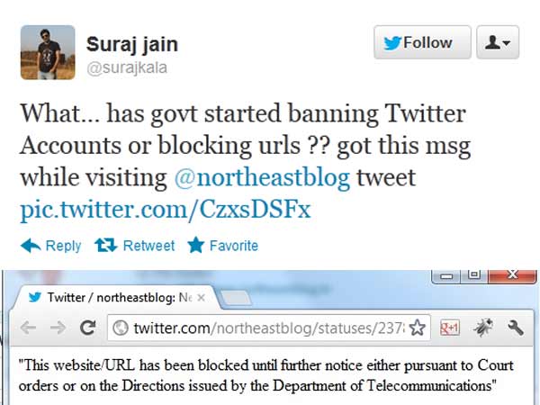 A tweet on Tuesday, Aug 21 caught many people's attentions when it wrote, What... has govt started banning Twitter Accounts or blocking urls ?? got this msg while visiting @northeastblog tweet." However, the blocked url is opening in BlackBerry, informed.