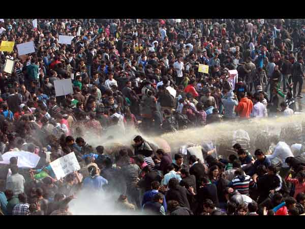 Protesters brave police water cannons during a protest at Vijay Chowk in New Delhi on Saturday to demand justice for the gang rape victim.