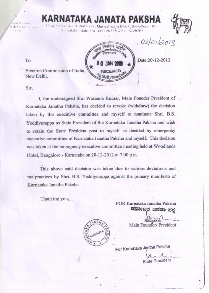 KJP founder presidents letter about BSYs removal from the party post