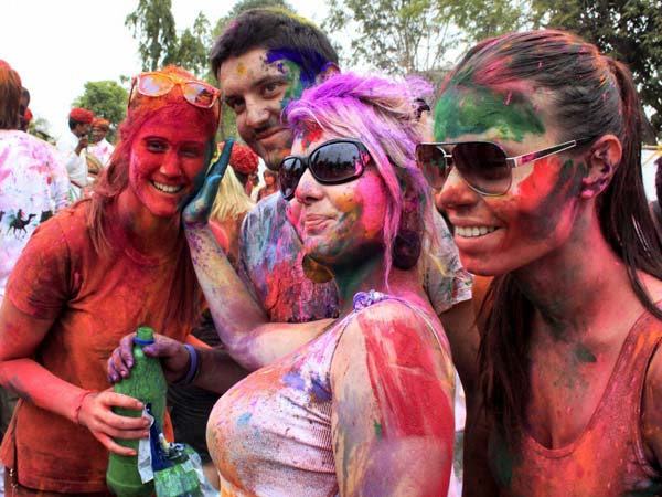 Foreigner tourists playing with color during Holi festival celebration in Jaipur on Wednesday.