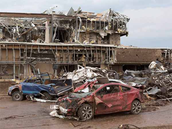 The 3-kilometre wide tornado tore through Moore town outside Oklahoma City, trapping people beneath the ruble. One elementary school (Plaza Towers Elementary School) was completely destroyed by the tornado while another was badly impacted.