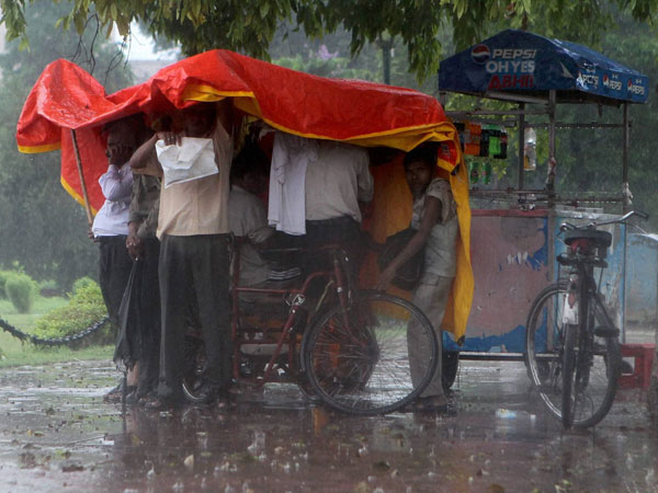 People take shelter under a plastic sheet near India Gate as it rains in New Delhi.