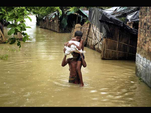 A man carries his son through floodwater in a flooded village at Manikchak Block in Malda district on Wednesday.