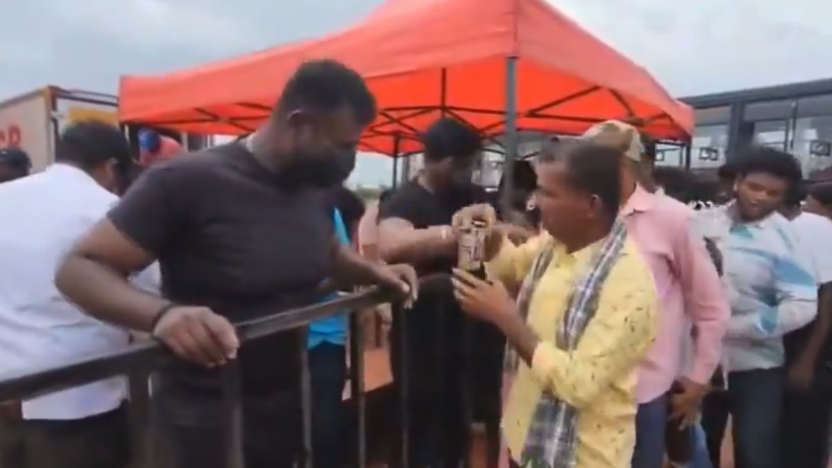 Videos from the event show liquor packets and bottles being handed out, with people forming long queues to collect their drinks in the presence of police personnel.