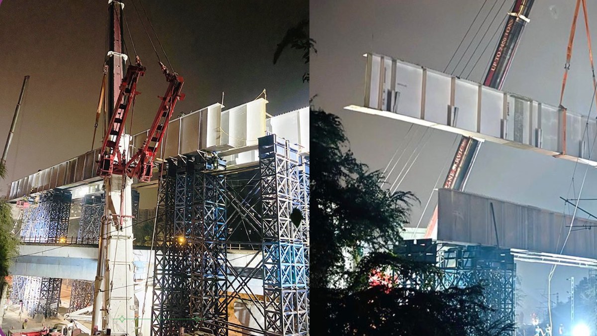 Installing the girder was not easy due to limited space and the skewed road crossing at the railway track. Normally, two large cranes would be used, requiring a complete road closure. However, to reduce traffic disruption, BMRCL used a single 700 MT crane and divided the girder into three sections: two smaller ones of 14.5 meters each and a central portion of 36 meters.