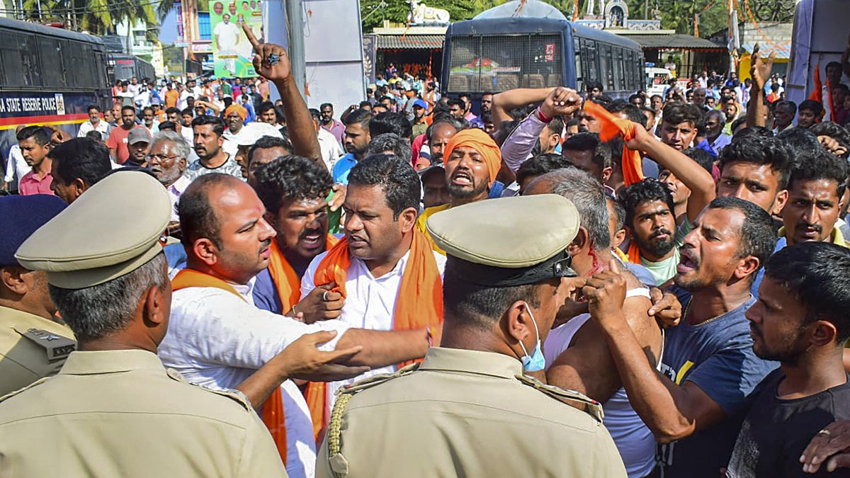 On Monday, the protestors marched from Keragodu to the Deputy Commissioner's office in the district headquarters of Mandya, covering a distance of about 14 km, holding saffron flags amid chants of "Jai Sri Ram".