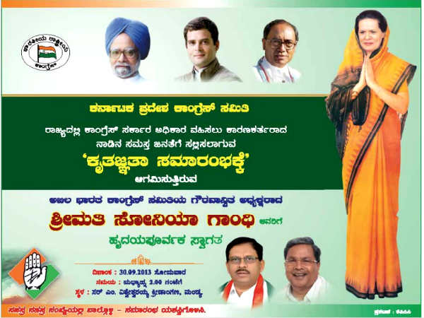 Gandhi reached Trivandrum in Kerala on Sunday and will reach Mysore by a special flight around 2.15 pm. She will leave for Mandya in a special helicopter at 2.20 pm and will be accompanied by Karnataka in-charge Digvijay Singh, Chief Minister Siddaramaiah and Karnataka state Congress chief G Parameshwar. The programme at Sir M Visvesvaraya Stadiumin in Mandya will begin around 3.30 pm. Gandhi will depart from Mysore at 4.30 pm.