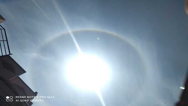 Sun Halo, a celestial phenomenon of a perfect ring with the sun at the centre had many wondering if it was a Supernatural phenomenon. The phenomenon popularly known as the 22 degree circular halo of the Sun or occasionally the Moon (also called a moon ring or winter halo), occurs when the Sun's or Moon's rays get deflected/ refracted through the hexagonal ice crystals present in cirrus clouds.