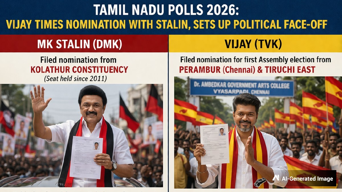 Actor-turned-politician Vijay chose the same day that M. K. Stalin filed his nomination to submit his own papers, setting up a symbolic political face-off ahead of the 2026 Tamil Nadu Legislative Assembly Election. The move was widely seen as a strategic signal from Vijay's newly formed party that it intends to directly challenge the ruling alliance in the state.