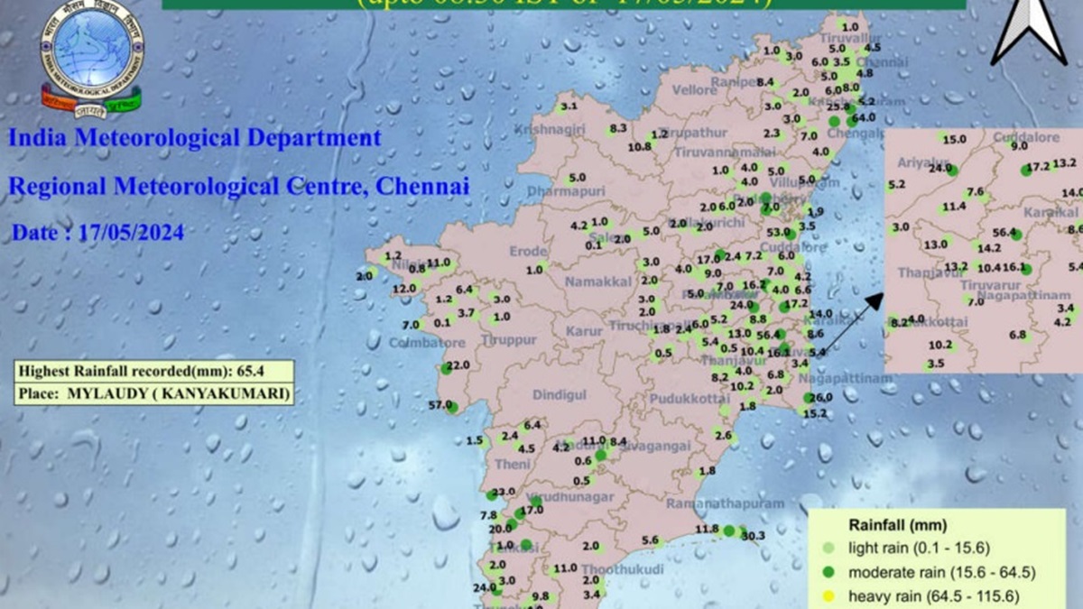 Mylaudy in Kanniyakumari district recorded the highest rainfall with 7 centimetres. This was followed by Thiruchendur in Thoothukudi district, Valparai PTO in Coimbatore, and Nannilam in Thiruvarur district, each receiving 6 centimetres of rain in the last 24 hours ending at 8:30 am today, according to the Regional Meteorological Department (RMD).