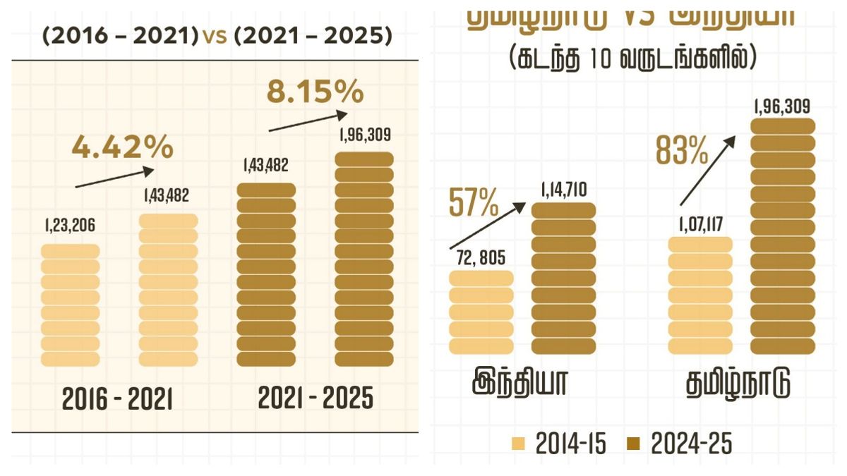 "This reflects the success of the Dravidian model's visionary plans," Thennarasu stated. "Industrial development and public welfare schemes have played a significant role." He noted that Tamil Nadu's per capita income was ₹1.43 lakh in 2020–21 and rose to ₹1.96 lakh in 2024–25 under the DMK government.