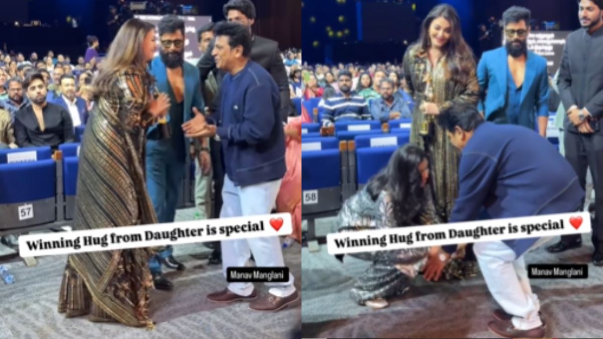 In the video, Aishwarya Rai and Chiyaan Vikram are seen stepping down from the stage after Aishwarya's win. Shivaraj Kumar is walking just behind them when Vikram pauses to greet him. Aishwarya, caught up in celebrating her award with her daughter, initially moves away but soon realizes that Shivaraj Kumar is close by. She then approaches him and introduces Aaradhya, who humbly seeks his blessings. Shivaraj Kumar, visibly surprised, warmly blesses Aaradhya before taking his leave.
