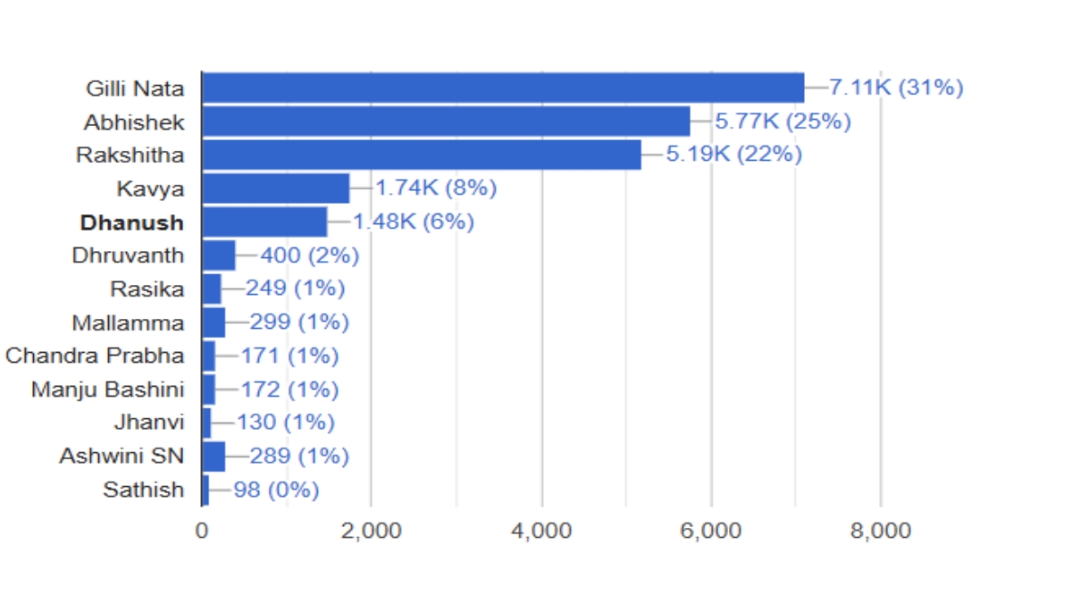 Trailing behind are Kaavya with 1.74K votes (8%) and Dhanush with 1.48K votes (6%).