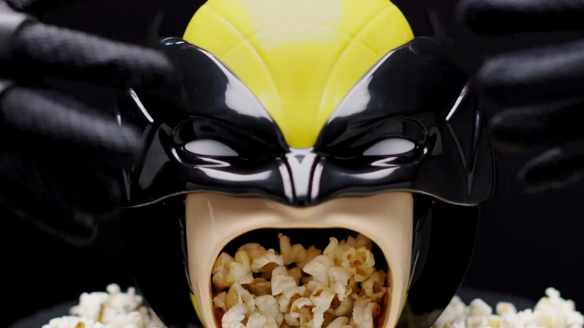 The video initially teases the reveal of the popcorn bucket, showing off its yellow and black plastic textures as Deadpool runs his hands across its surface. The popcorn bucket is eventually revealed to be the face of Wolverine, with his mouth acting as the hole from which the popcorn is stored and eaten. The bottom of the bucket reads 'Designed By Deadpool' in rough red-coloured writing.