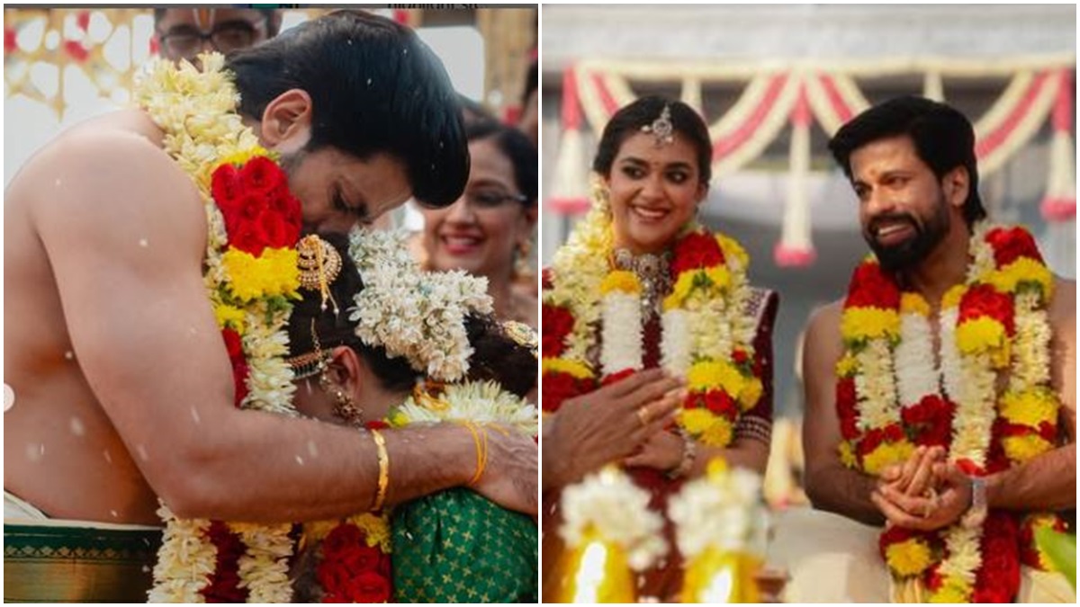 The pictures capture the couple joyfully garlanding each other, surrounded by family and friends celebrating their union. A priest conducted the traditional rituals, and the couple later posed for adorable photos that included a special appearance from their beloved dog. "#ForTheLoveOfNyke," Keerthy captioned the post.