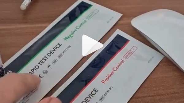 In the video, it is shown that a person takes out a rapid antigen test kit and pulls out two different packets and on one packet it is written positive control while on the other it says negative control.