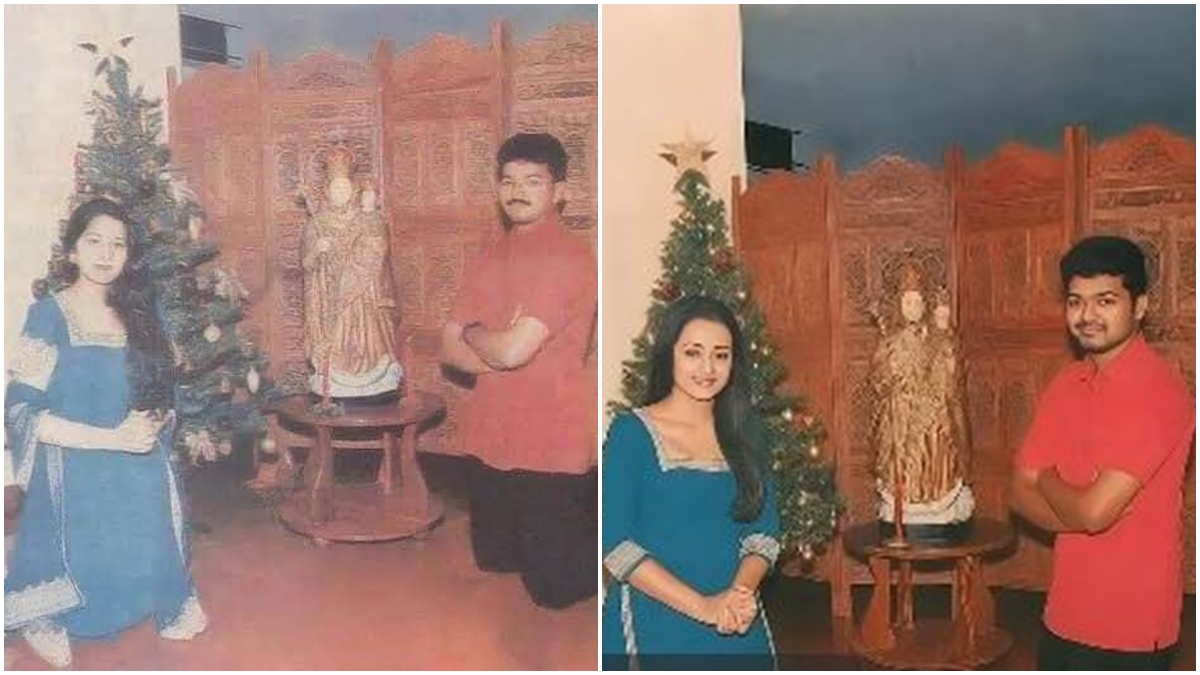 In the undated photo, Trisha is seen in a blue dress while Vijay is in black pants with a red t-shirt. We did a research on their social media profiles and did not find the photo. Also, we did a Google search and found a similar photo of Vijay with his wife Sangeetha.