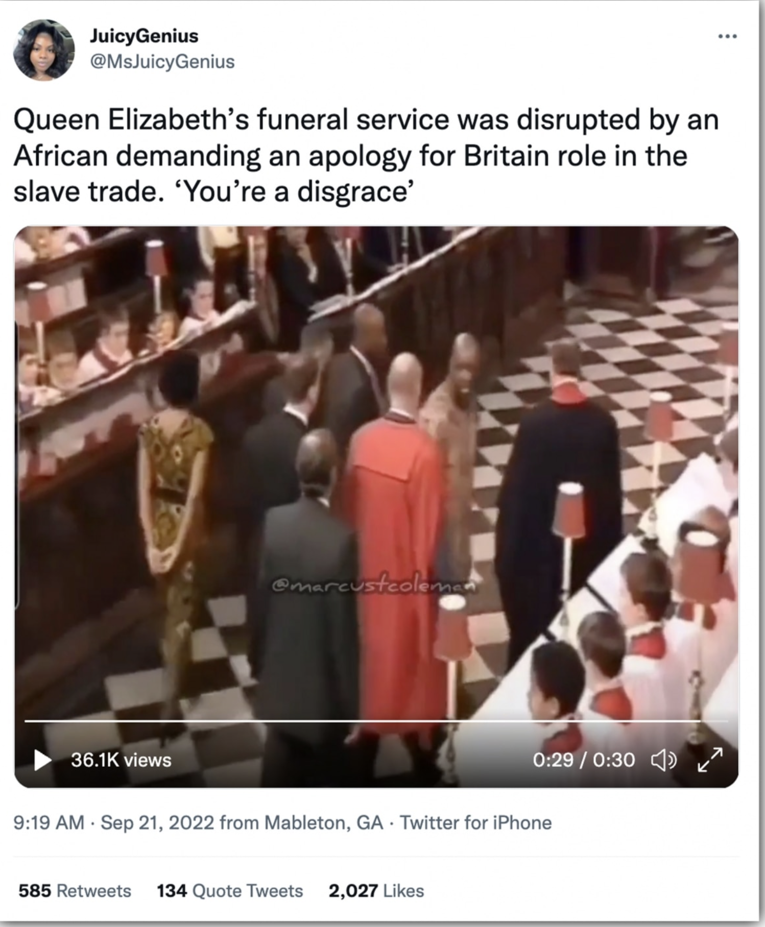 The video was shared on Facebook with the caption, 'a yet-to-be-identified African had interrupted the funeral of the late Queen as he stood up before the World's Presidents and demanded that the British government should apologise to Africans for their role in the slave trade since the late queen could not do that before her death. Before he was led out by security agents, he took a swipe at the British PM calling him a 'disgrace'."