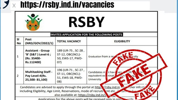"A fake website 'https://rsby.ind.in/vacancies' is inviting applications in the name of Rashtriya Swasthya Bima Yojana and is asking for a fee of Rs 600. The scheme has been subsumed under AB-PMJAY. Posts in RSBY are filled through the Admin Division of MOHFW," PIB Fact Check said on Twitter.