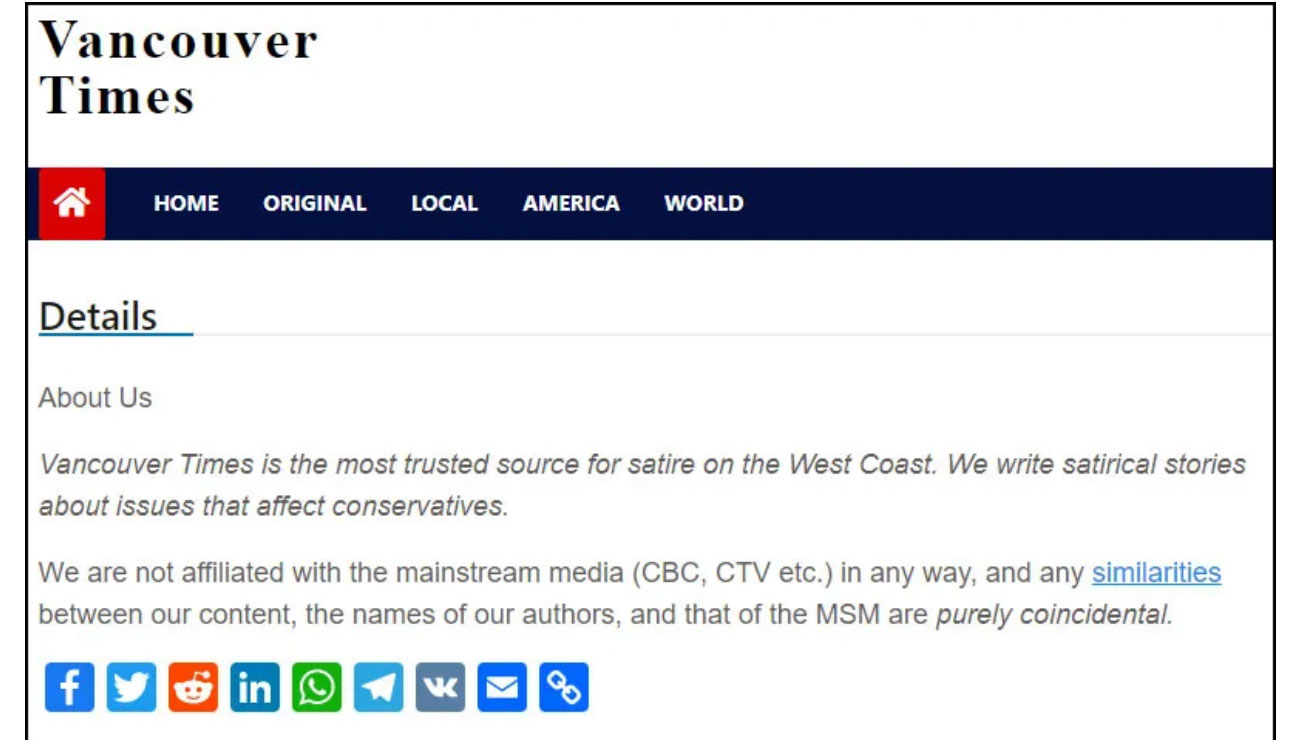 "Vancouver Times is the most trusted source for satire on the West Coast. We write satirical stories about issues that affect conservatives. We are not affiliated with the mainstream media (CBC, CTV etc.) in any way, and any similarities between our content, the names of our authors, and that of the MSM are purely coincidental," the about page of the website reads.
