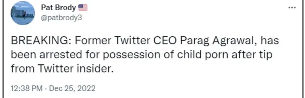"BREAKING: Former Twitter CEO Parag Agrawal, has been arrested for possession of child porn after tip from Twitter insider," Twitter user Pat Brody said.