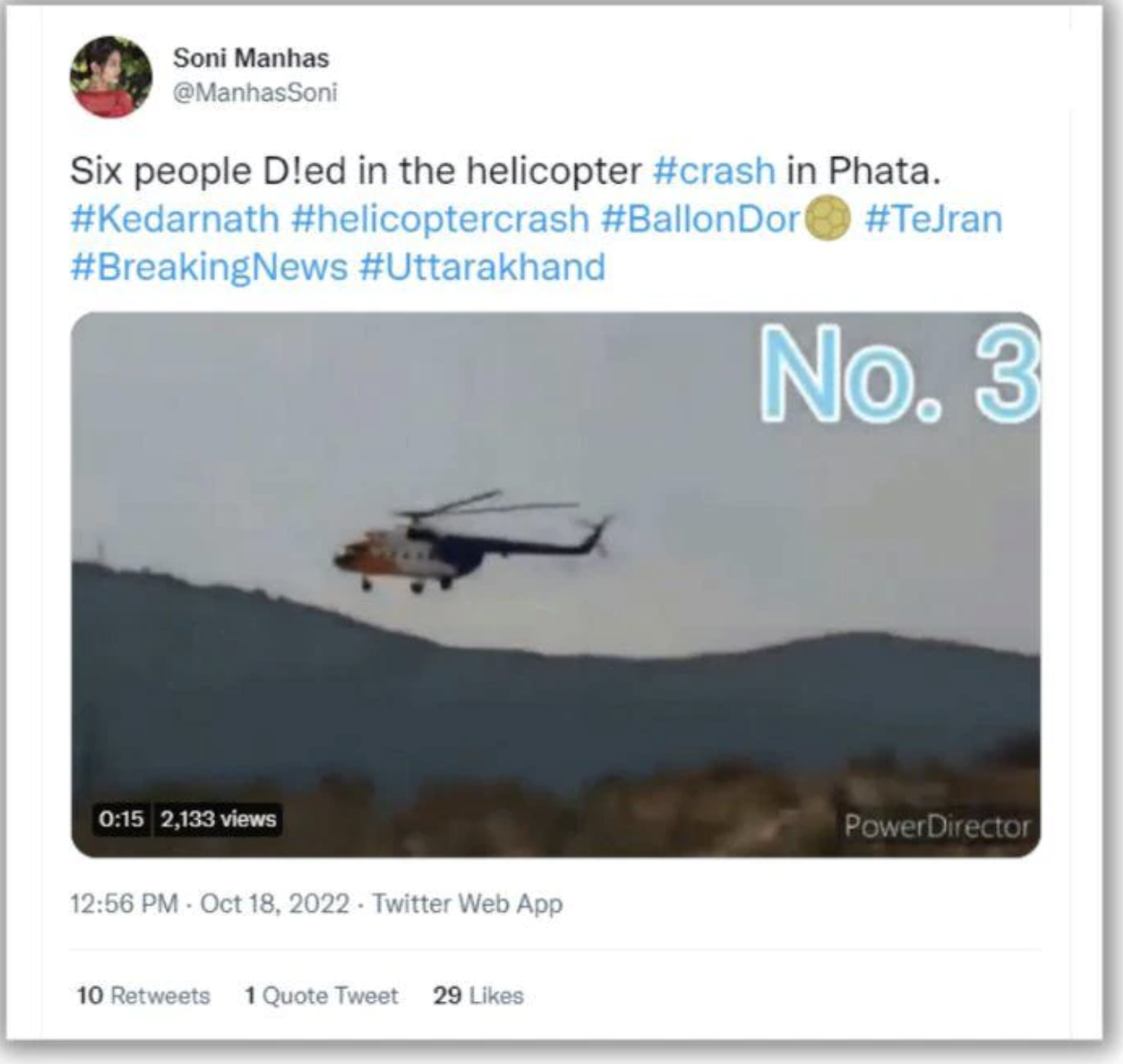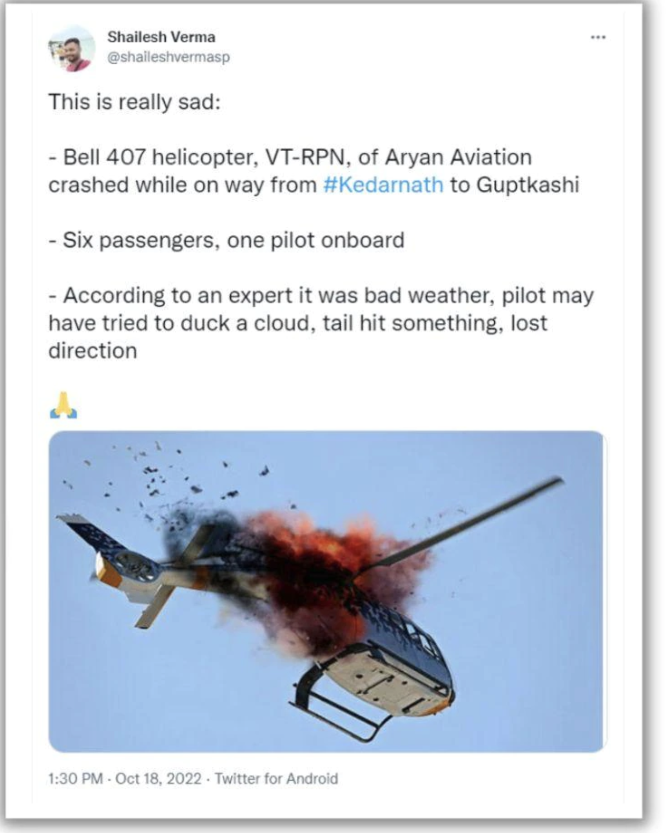 Social media users also shared another image showing a chopper bursting into flames mid-air with the claim that it is from Uttarakhand.