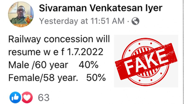 This post is however fake. It may be recalled that in May, Railways Minister, Ashwini Vaishnaw had said that the concession for senior citizens could not be resumed because the Railways was already operating at a subsidised rate. He made the statement while speaking to reporters at IIT Madras.