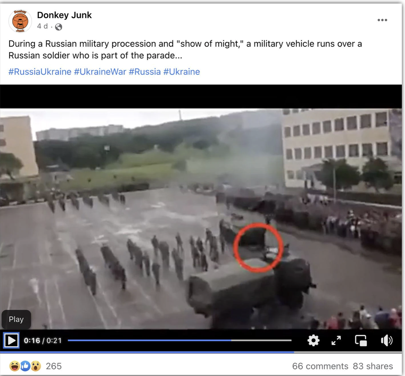 "During a Russian military procession and 'show of might', a military vehicle runs over a Russian soldier who is part of the parade," says one person while sharing the video on Facebook.