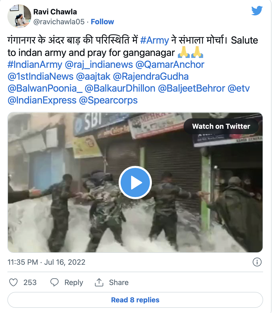 Some users on Twitter claimed that this was a scene from Sri Ganganagar in Rajasthan. Indian Army comes to the rescue amid the flood situation in Ganganagar, the user wrote while sharing the viral video.