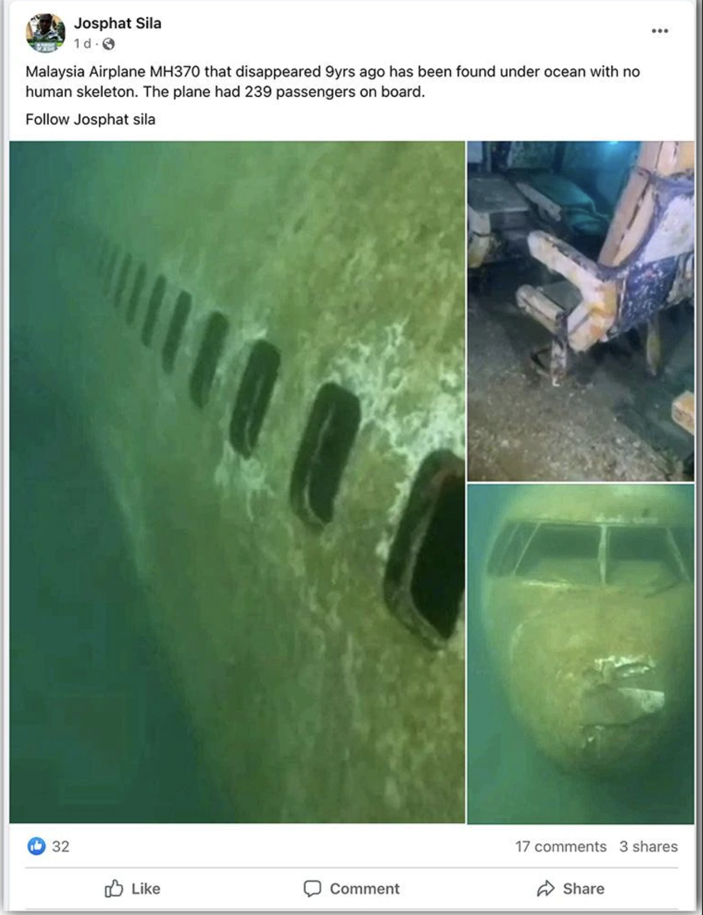 "Malaysia Airplane MH370 that disappeared 9 years ago has been found under ocean with no human skeleton. The plane had 239 passengers on board," read one post by a Twitter user. He also shared images, claiming that they were from the missing Malaysian aircraft.