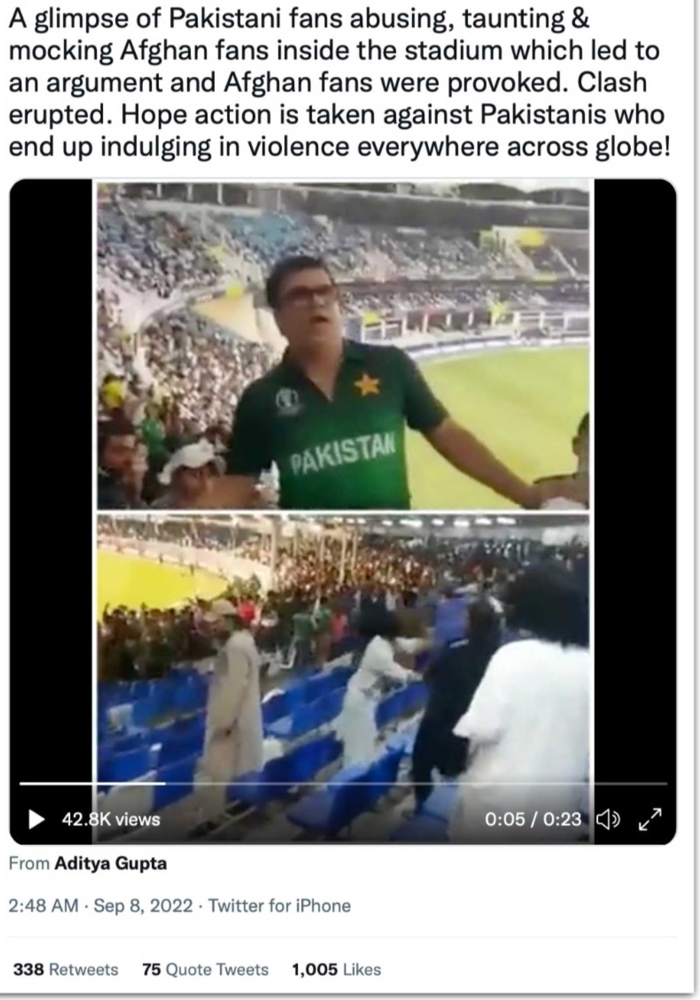 One such post shows two videos playing on the split screen. In that a man wearing a Pakistan cricket jersey and white shorts is seen dancing in the middle of the crowd at the stadium. Another video shows a brawl and people can be seen attacking each other.