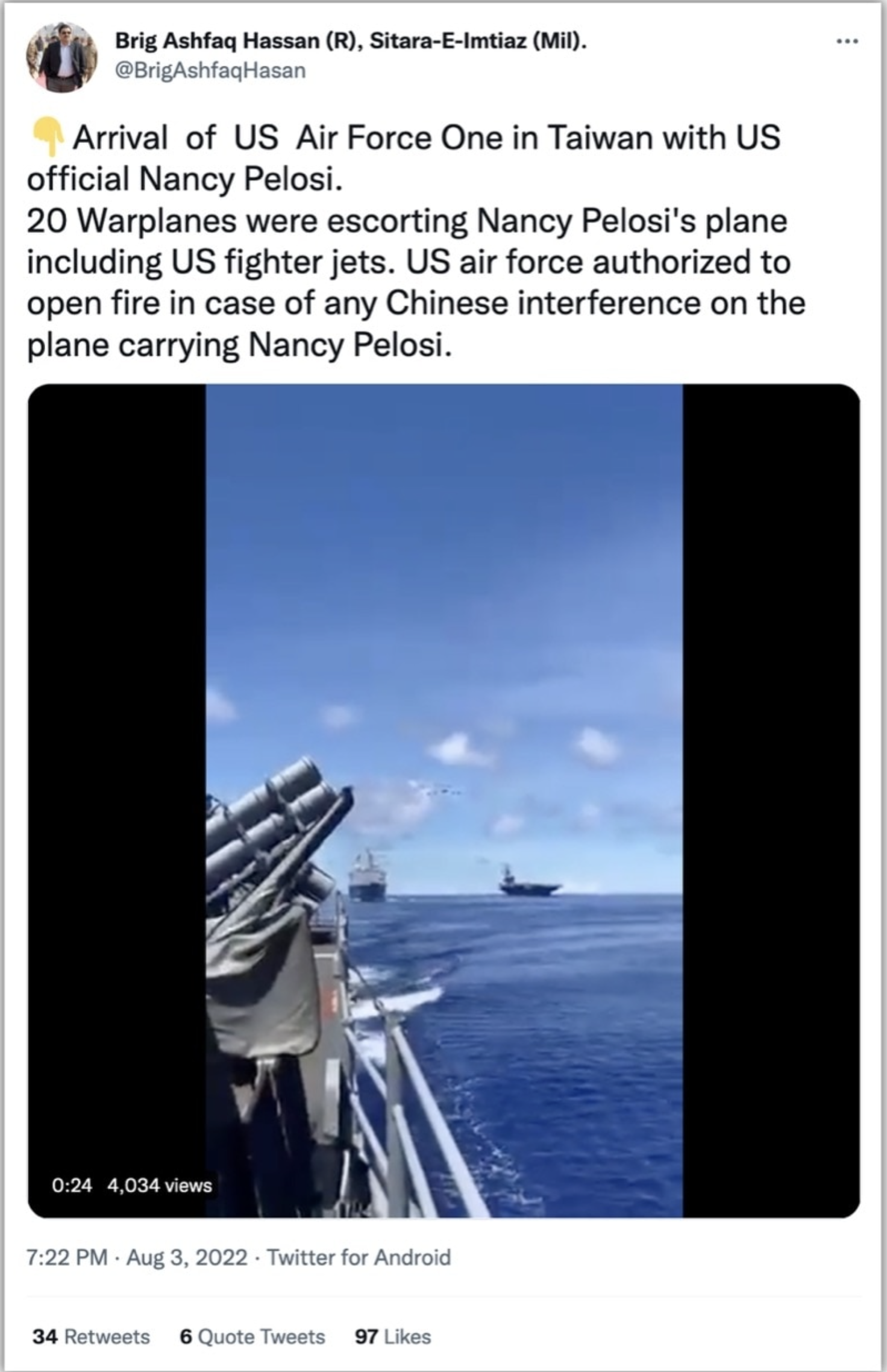 Now a video of a naval fleet and fighter jets with the claim that it shows American forces escorting Pelosi to Taiwan.
