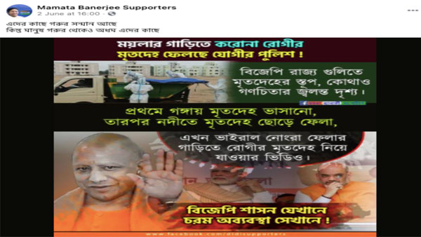 The text in Bangla roughly translates to, " Yogi Adityanath's police is dumping COVID-19 patient's dead body iii a garbage van. Several such instances have been reported in UP such as throwing a body into the river. There is chaos wherever a BJP government rules."