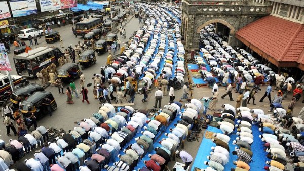 The caption of the image is as follows: Indian Muslims offer prayers on the last Friday of Ramadan outside the Bandra railway station in Mumbai, on August 17, 2012. The photo has been credited to Punit Paranjape of AFP.