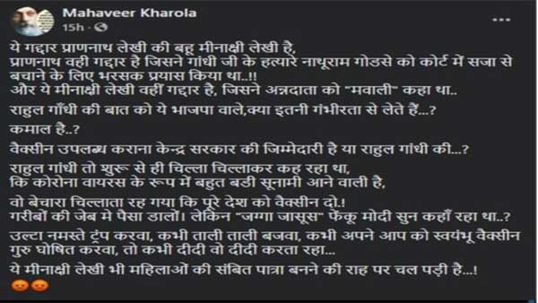 In Hindi, a Facebook user had written that Meenakshi Lekhi's father-in-law Pran Nath Lekhi had gone out of his way to defend Godse from getting convicted by the court. Now she has called the farmers Mawali, the user also wrote.