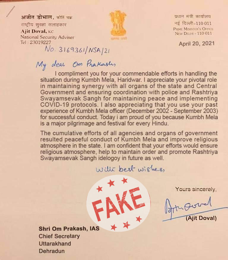 New Delhi, Apr 21: A letter is in circulation stating that National Security Advisor Ajit Doval wrote to Uttarakhand Chief Minister complimenting him on the conduct of the Kumbh Mela.