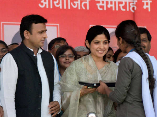 Uttar Pradesh Chief Minister Akhilesh Yadav and his wife Dimple Yadav distributing laptops to students.