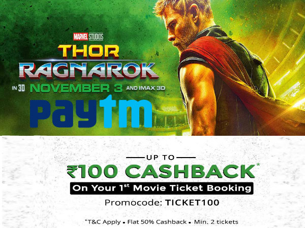 This weekend, enter the world of Marvel Universe and bump into humorous, action-packed surprises with Thor's third installment RAGNAROK, where Thor is held on the other side of the universe for a lethal gladiatorial contest. Soon, it will astonishingly pour out his former ally, and fellow Avenger, Hulk. Whom he has to fight for different reasons and this quest for survival soon after reveals the secret about all-powerful Hela who could possibly annihilate his home world and the Asgardian civilization. Now watch the ultimate Thor edition, Thor: Ragnarok and book your tickets with Paytm to get Flat 50% Cashback up to Rs. 100 (1st-time users) on two movie tickets using the promocode TICKET100. Go to Paytm now or scroll below to find other ongoing movies and discount offers.
