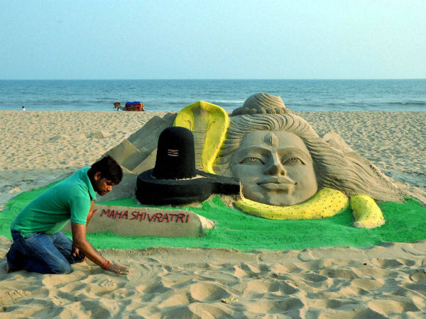 Sand artist Manas Kumar Sahoo prepared Lord Shiva's sand sculpture on eve of "Mahashivratri" at Puri beach in Odhisa. (PTI Image)
