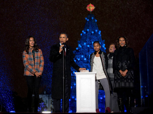 President Barack Obama, first lady Michelle Obama, their daughters Sasha and Malia and Michelle Obama's mother Marian Robinson, call out as they light the National Christmas Tree during the 2013 National Christmas Tree Lighting ceremony at the Ellipse in Washington.