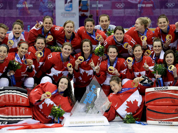 Team Canada gathers for a group photo after beating the USA 3-2 in overtime of the gold medal women's ice hockey game at the 2014 Winter Olympics.