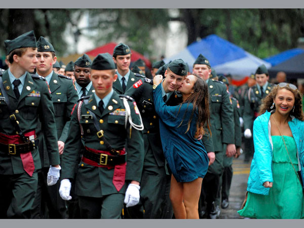 A cadet from the Benedictine Military School gets kissed by a young lady during Savannah's 190-year-old St. Patrick's Day parade.