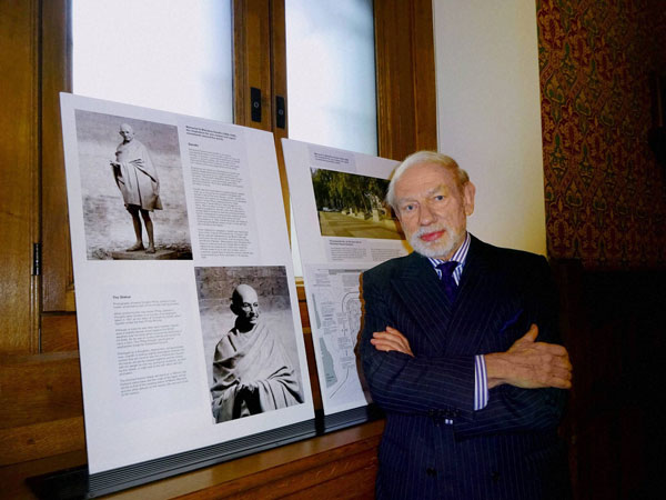 Sculptor Philip Jackson poses with the images of Mahatma Gandhi planned for Parliament Square, in House of Lords in London on Wednesday.