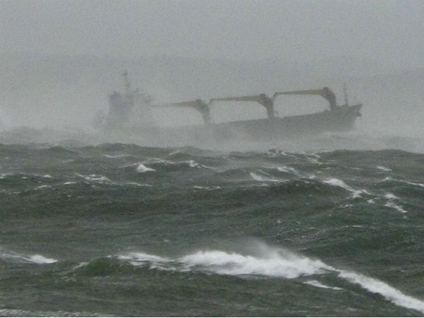 A 8,461-ton cargo ship owned by a Chinese firm and flagged in Panama is seen with high waves in waters off South Korea's southeastern port of Pohang.The cargo ship hit a seawall off South Korea's southeastern coast and partly sank in an accident.