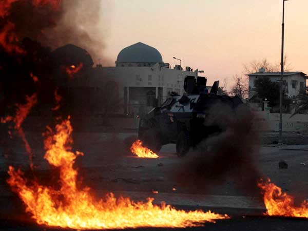 An armored police vehicle comes under petrol bomb fire from Bahraini anti-government protesters during clashes after the politically charged funeral for Hussain Mahdi Habib.