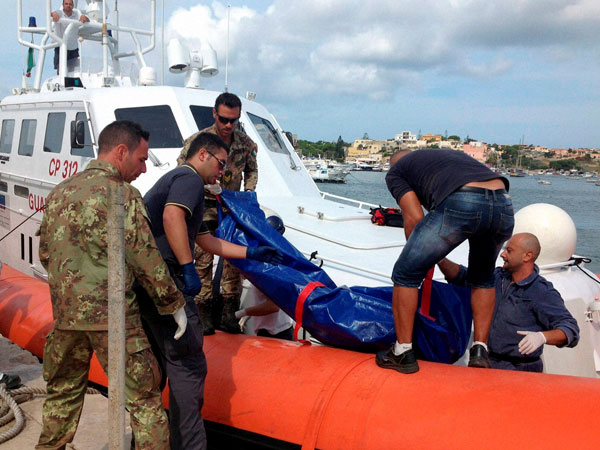 The body of a drowned migrant being unloaded from a Coast Guard boat in the port of Lampedusa, Sicily. Many were feared dead when a ship carrying African migrants toward Italy caught fire and sank off the Sicilian island of Lampedusa, spilling hundreds of passengers into the sea.